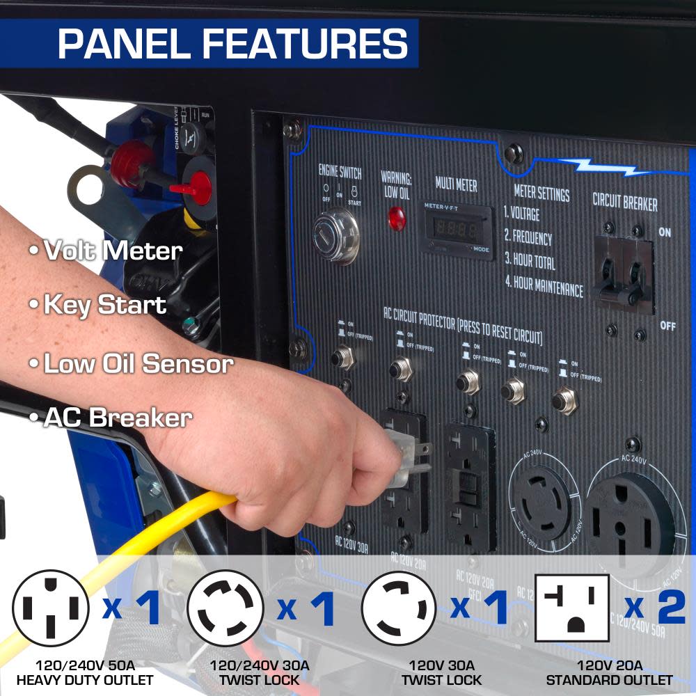 Fully featured power panel includes four 120 V household GFCI outlets, one 120 V 30 A twist lock outlet, a 240 V 30 A outlet, and one 240 V 50 A outlet. the panel also includes a digital voltmeter for tracking output and maintenance hours