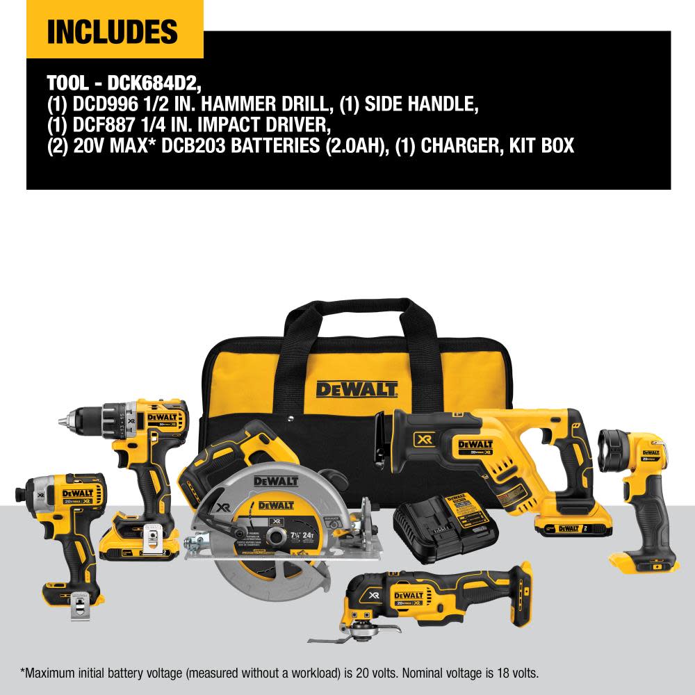 This DeWALT combo kit includes DCD791 compact drill/driver, DCF887 impact driver, DCS570 circular saw, DCS367 reciprocating saw, DCS355 oscillating multi-tool, DCL040 work light. Compact drill/driver with two-speed transmission and 3-mode LED lights with a spotlight mode for working in dark spaces. Drill/driver tool has a DeWALT built brushless motor that delivers up to 57% more run time. The 20 Volt Max XR® 1/4 Inch impact driver with brushless motor has compact design for fitting in tight spaces. This tool has 3-speed settings for versatility with Precision Drive™ feature for increased control. Impact driver tool comes with three LED lights, which makes it ideal for working in the dark. The 20 Volt Max XR® circular saw features a brushless motor for providing 5200 RPM, thus maintaining speed under load. This saw uses a 7-1/4 Inch blade to provide 2-9/16 Inch cutting capacity at 90 degrees. Circular saw has runtime to complete 330 crosscuts in 2×4 pine. The 20 Volt Max XR® reciprocating saw features a compact and lightweight design to make your jobs easier. This recip saw has a Variable speed trigger with 0 to 2900 SPM. The 20 Volt Max XR® oscillating multi-tool has a powerful brushless motor providing up to 75% more run time over a similar brushed tool. Multi-tool has a Quick-Change™ accessory system that allows blades and attachments to be changed quickly without wrenches. Work light is a bright flashlight that illuminates your work area with LED output of 110 Lumens.