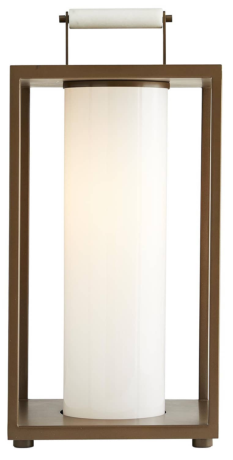 Arteriors 49203 Stetson Aged Brass Outdoor LanternBuilt for the great outdoors, this versatile lantern pairs the resilience of industrial style with a modern aesthetic. The steel frame is finished in an aged brass, so it exudes a debonair attitude, but the clean lines and simple construction allow it to blend in with any surrounding. The top is fitted with a handle accent, recalling a traditional lantern function, and the bulb is concealed in an opal glass sleeve, casting warm light all around. Also available in aged iron (49202). Features General