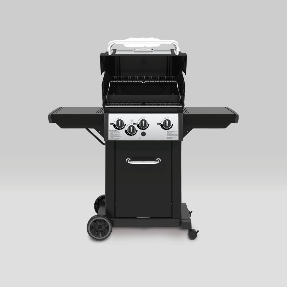 The Monarch™ 340 features 330 sq. in. primary cooking surface and includes 3 stainless steel Dual-Tube™ burners, reversible heavy-duty cast iron cooking grids, stainless steel Flav-R-Wave™ cooking system, and electronic ignition. The Monarch™ 340 features painted steel drop-down side shelves and enclosed cabinet base.