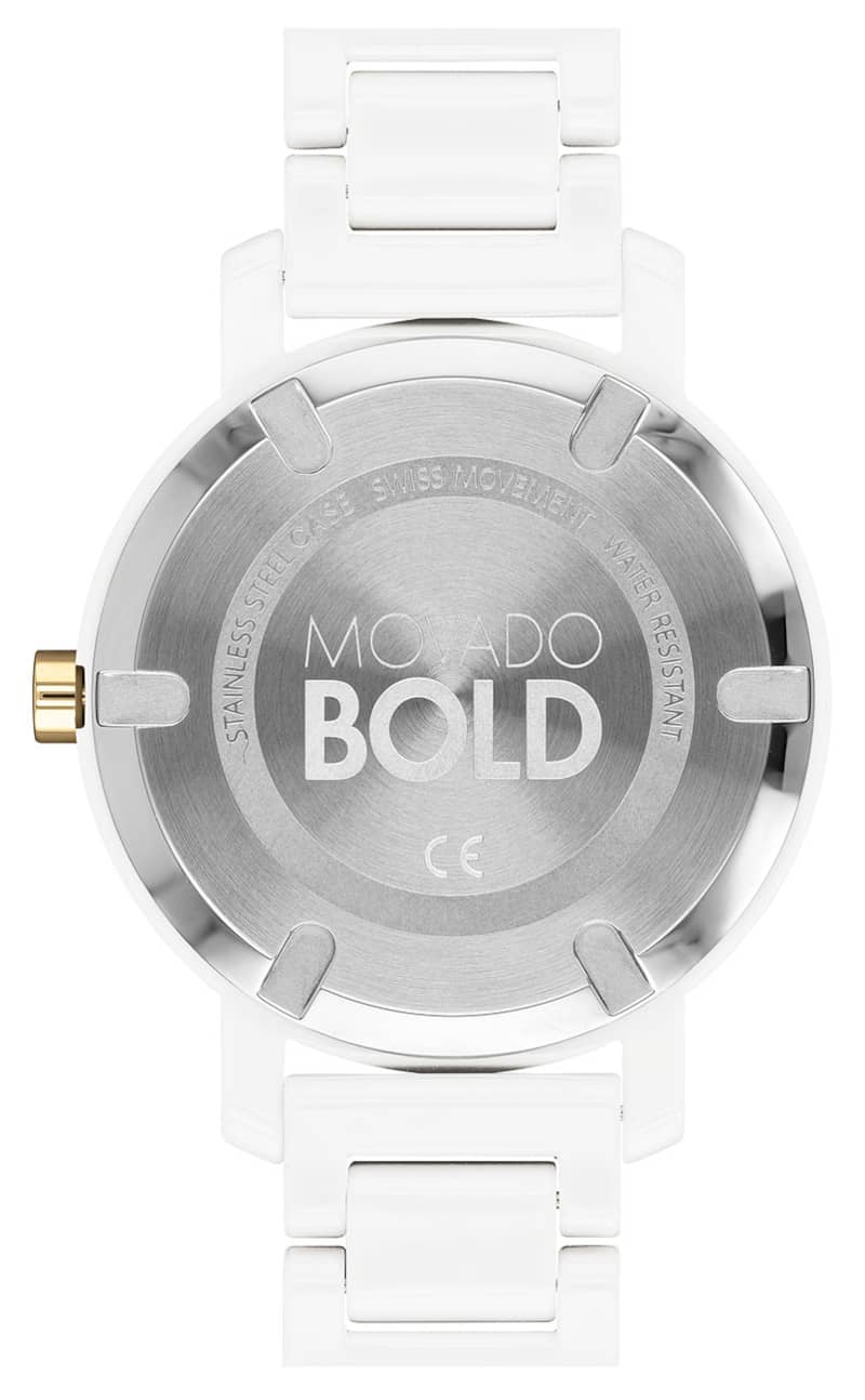 Movado BOLD Evolution 36mm w/ White Dial & Ceramic Link Bracelet, Model 3600710Movado BOLD Evolution, 36 mm white ceramic case and bracelet featuring a pale yellow gold ion-plated stainless steel bezel & white-toned dial. Beyond The Dot: