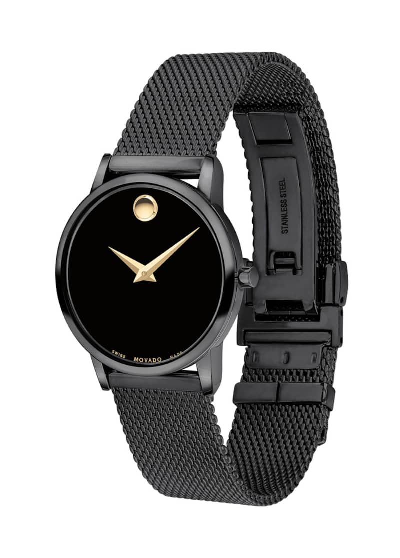 Movado Museum Classic 28mm Watch w/ Black Dial & Mesh Bracelet, Model 0607493Movado Museum Classic, 28mm black PVD-finished stainless steel case and mesh bracelet with black-toned dial & yellow gold PVD-finished accents. Beyond The Dot: