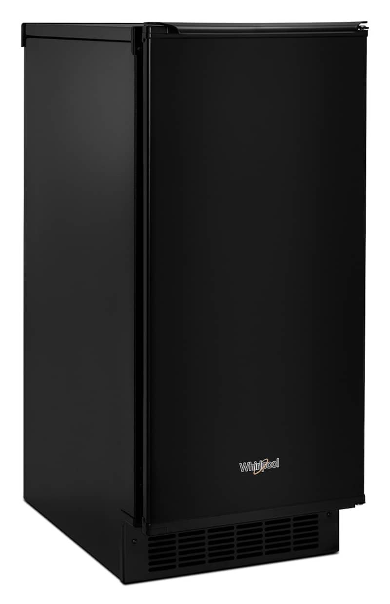 Whirlpool WUI75X15HB 15″ Black Icemaker With Clear Ice TechnologyKeep plenty of fresh ice on hand, wherever you need it most, with icemakers that store up to 25 pounds of ice and can be installed under a counter or on their own. Clear Ice Technology removes the gases and impurities in ice that cause cloudiness and foaming in carbonated drinks, while the Fast Ice Option speeds up ice production. Also, an easy-to-use Ice Scoop lets you quickly serve up cold beverages or fill coolers. Features