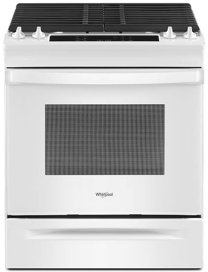 Whirlpool WEG515S0LW ADA 5 Cu. Ft. White Gas Range With Frozen Bake TechnologySimplify steps in the cooking process with this gas slide in range that lets you skip preheating for frozen favorites with Frozen Bake™ Technology. Get more flexibility on the cooktop with two high heat burners and edge-to-edge cast iron stove grates. This range is also equipped with a high-temperature, adjustable self clean oven cycle so you can clean without using chemicals. Features