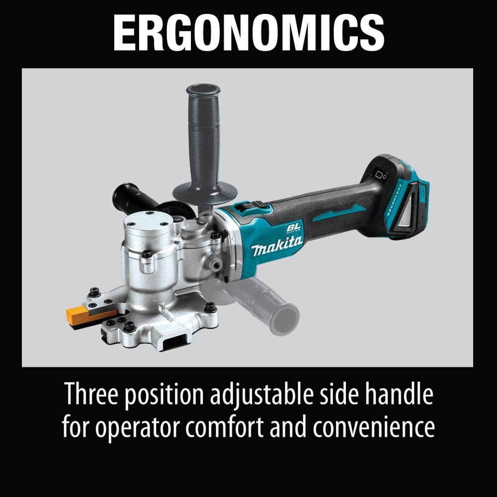 The Makita cordless rebar cutter kit is powered by a brushless motor that delivers 2200 RPM for faster spark-free cutting. It is perfect for cutting #8 rebar or 1 Inch threaded rod. Brushless motor is electronically controlled to minimize battery energy use up to 50% longer run time per charge. The ergonomically designed handle is provided with rubberized grip so that the user can work for long duration without any fatigue. Adjustable stopper holds the rebar at 90 degree offering more support while cutting. The 3-stage LED gauge indicator gives a clear picture about battery charge level. It is equipped with star protection computer controls that safeguards against over-loading, over-discharging and over-heating. Wire mesh intake covers are designed to avoid debris from entering motor. Carbide-tipped blade provides clean burr-free cutting with minimal spark emission. Chip collector allows for capturing metal cut-offs for added convenience.