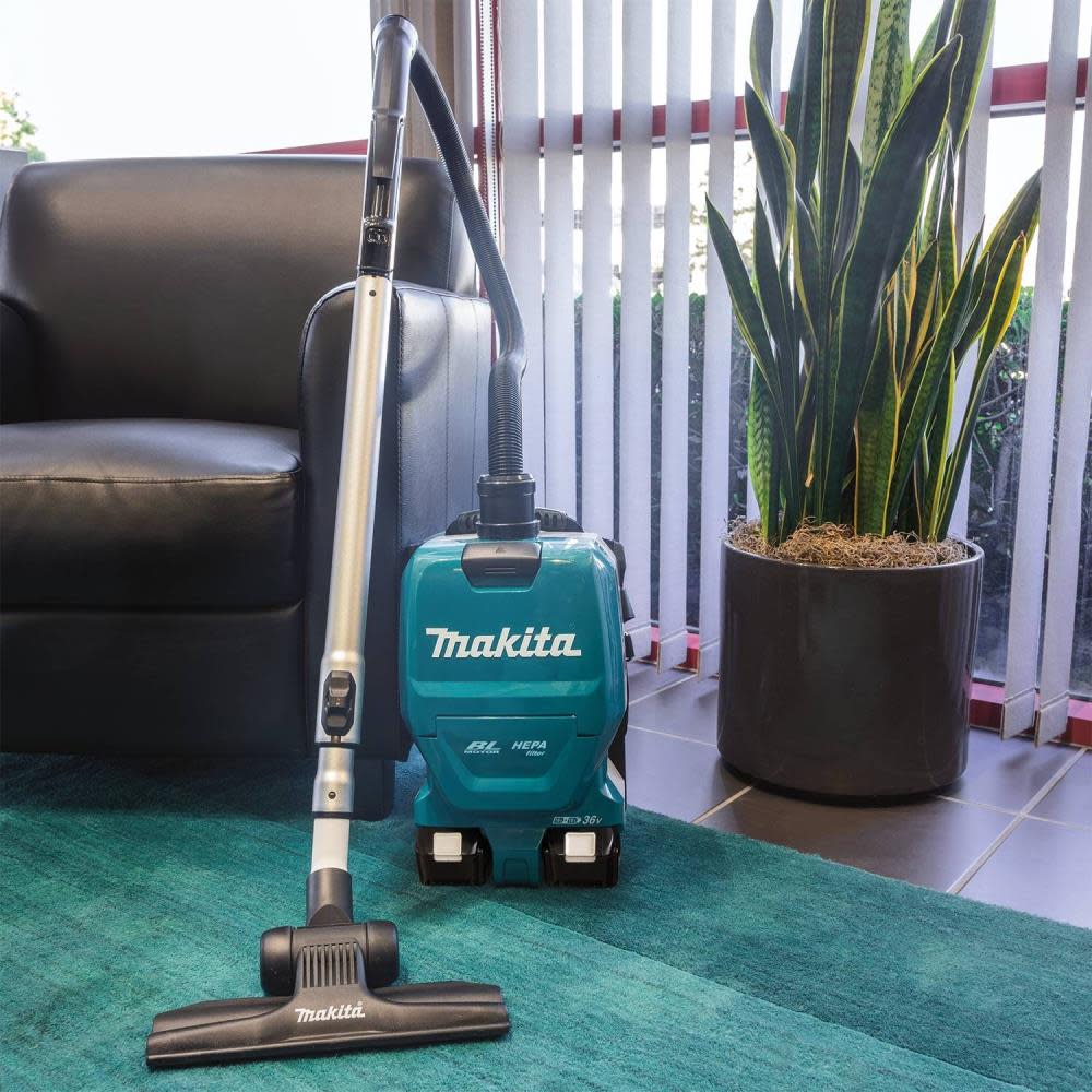 The Makita 1/2 gal cordless wet/dry dust extractor/vacuum kit includes two 18 Volt LXT® Lithium-Ion 5.0 Amp-hour batteries, dual port rapid charger, flexible hose, telescoping extension wand, floor nozzle, HEPA filter and filter dust bag. Vacuum is powered by a brushless motor that delivers 70 cfm of suction power and 44 Inch of water lift. Lithium-Ion batteries offer up to 116 minutes on normal settings and 33 minutes on maximum setting. The efficient three stage HEPA filtration system has capacity to capture up to 99.97% of particulates and also maintains optimum suction efficiency and longer filter life. Brushless motor is electronically controlled to minimize battery energy use up to 50% longer run time per charge. The star protection computer controls safeguards from overloading, over-discharging and over-heating. Lithium-Ion 5.0 Amp-hour battery has dual LED indicator to alert on the battery status. Motor chamber is constructed using quality sound-absorbing materials, which makes this vacuum to operate at very low sound level of 69 dB. Padded shoulder straps and waist belt with multiple adjustments provides improved fit. Built-in LED light illuminates work area allowing to work with ease even in low light conditions.