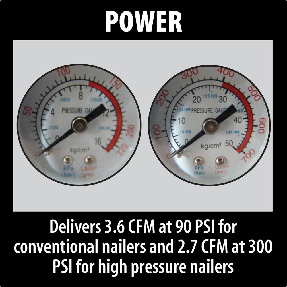 The Makita high pressure air compressor consists of a four-pole induction motor mechanism to enhance operational efficiency. Low AMP draw mechanism minimizes the events of tripped breakers. Dual capacity feature delivers a power rating of 3.6 CFM at 90 PSI and 2.7 CFM at 300 PSI to enable working with high-pressure nailers. The 2.5 HP power rating and the 1.6 gallon tank delivers a great performance with minimal noise. High pressure mechanism operates at a pressure rating of 400 PSI and helps in enhancing the air pressure and delivers it to pneumatic nailers. Oil-less pump makes it easy to maintain at a very less cost. Unique roll cage and kick plate construction safeguards the pump as well as the motor assembly. Rubberized bumpers prevent any scratches to the surface and the large regulator knobs makes it easy to operate. Compressor comes with two universal quick couplers and two high pressure quick couplers.