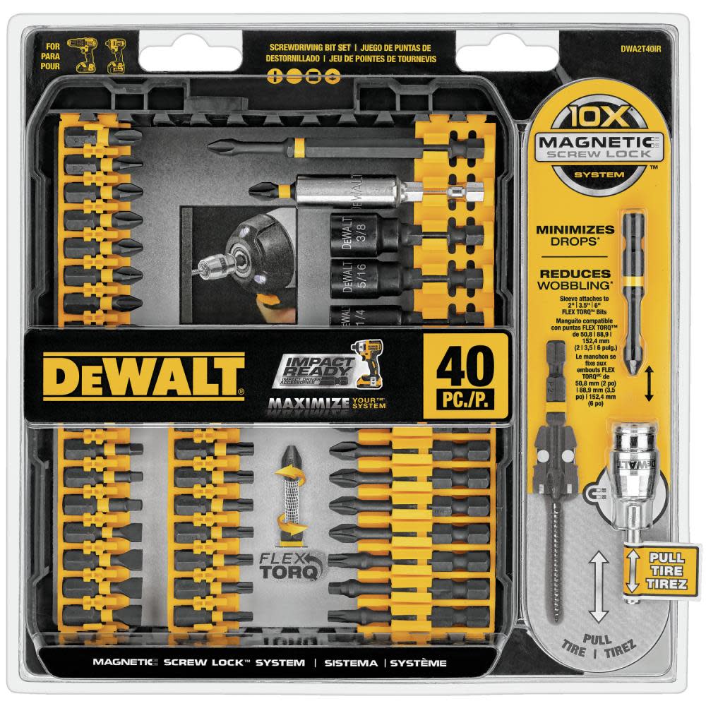 DWA2T40IR is impact ready for use in impact drivers. CNC machined bit tips for precise fit and to help reduce cam-out. FlexTorq Zone for durability and long life. 10X Magnetic Screw Lock System(TM) to minimize drops and wobbles. Includes: (1) socket adapter, (1) magnetic bit tip holder, (1) magnetic sleeve, (2) nut drivers, (25) 1-in screw bits, (9) 2-1/4-in screw bits, (1) 3-1/2-in screw bit.