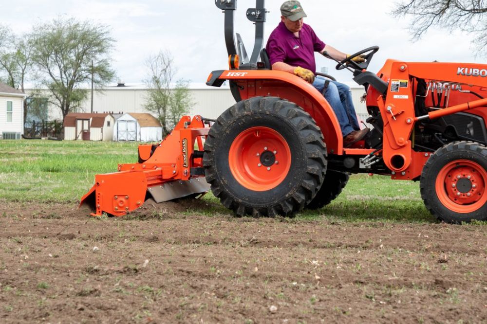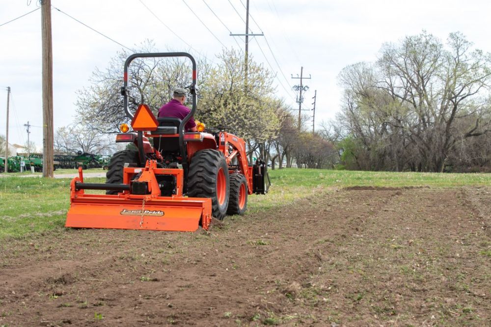 The Land Pride RTR12 reverse-till rotary tillers turn the soil to prepare a seedbed for gardening or lawn seeding. With uses in landscaping, gardening, and other residential applications, the RTR12 series offers an economical tilling solution. The RTR12, and all Land Pride reverse rotation tillers, tends to achieve greater depth of penetration, moving and pulverizing more soil in the process, while burying residue as opposed to leaving it on top. The solid steel shaft provides extra strength to the rotor and the RTR12 offers offset capabilities, allowing the tiller to work closer to objects such as fence lines, buildings and trees. Note: quick-hitch may require a longer driveline, which is available through Land Pride parts.