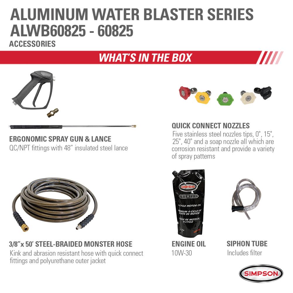 Designed to meet the rigorous demands of the cleaning professionals, the Simpson aluminum water blaster series frame is crafted of aircraft-grade aluminum, making it lighter in weight than most steel frame pressure washer designs. Perfect for contractors who specialize in deck cleaning, wood restoration, paint preparation, graffiti removal, and all other professional cleaning services. The Simpson Aluminum water blaster series is designed for optimum performance in the harshest environments.