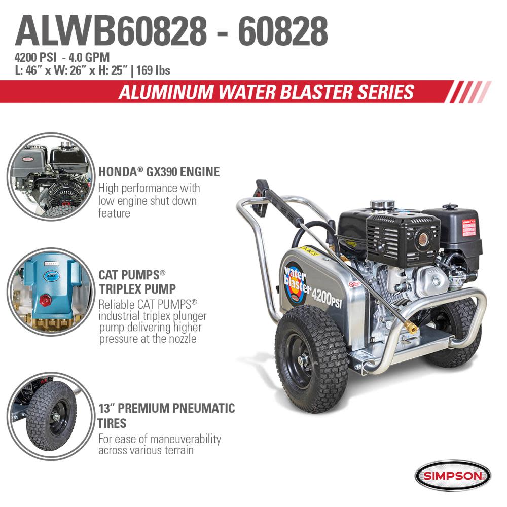 Aluminum Water Blaster 4200 PSI at 4.0 GPM HONDA GX390 with CAT Triplex Plunger Pump Cold Water Professional Belt Drive Gas Pressure Washer (49-State)