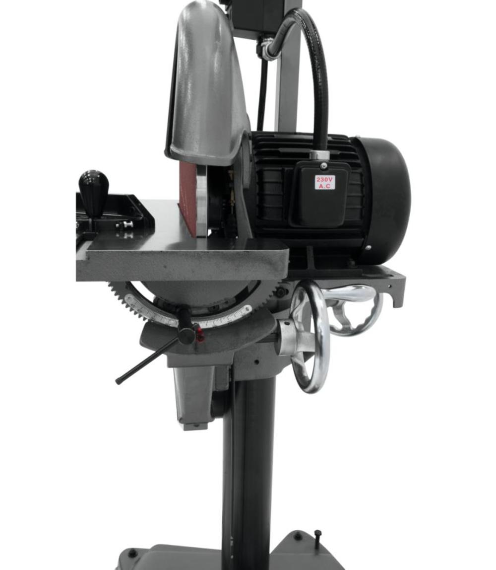 Extra large tilting table lowers completely below disc for use of the entire disc surface