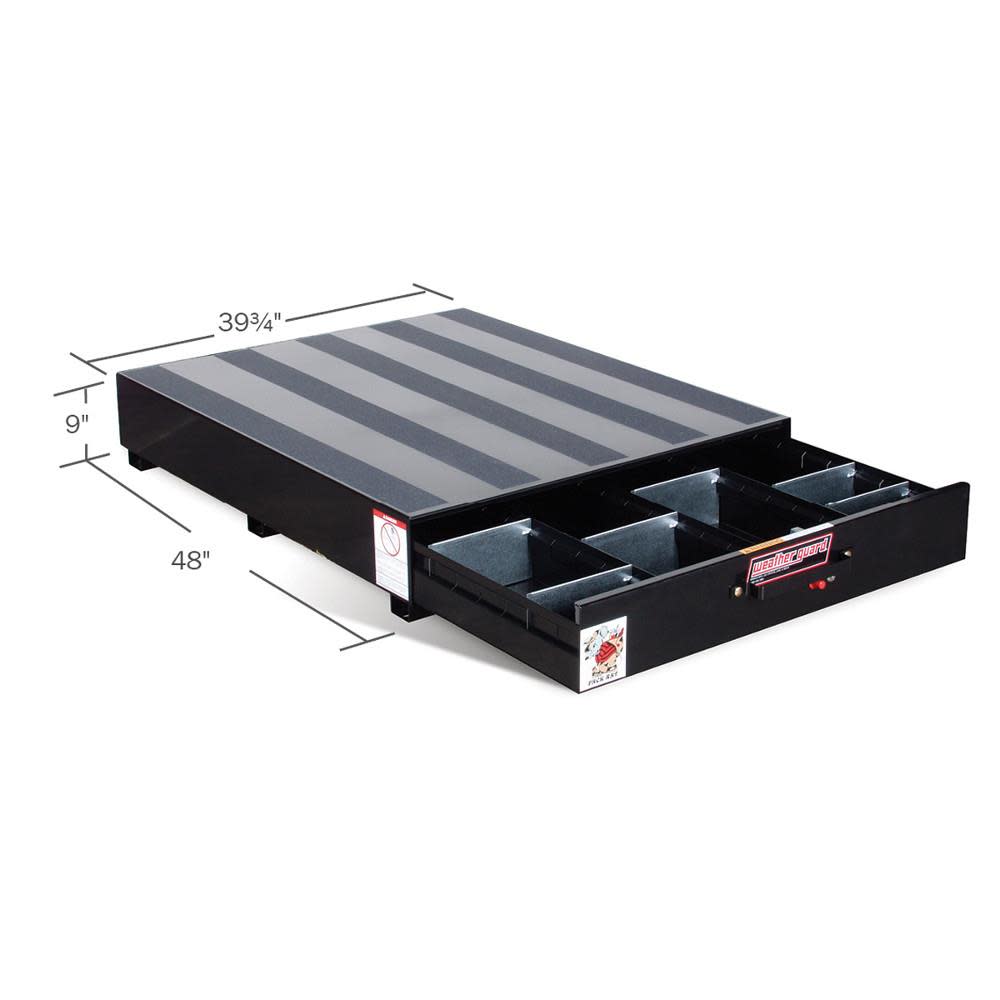 Heavy-duty storage keeps bed space open and supplies organized. The model 308-3 black steel pack rat standard drawer unit has 4 compartments with 24 dividers and has a load rating of 750 lbs. This unit can be mounted inside the rear of the vehicle to provide easy access to large tools and supplies while leaving floor space open.