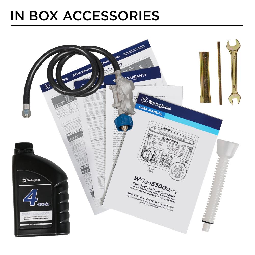 Included: oil, funnel, battery charger, key fob, propane hose, quick start guide, and user manual